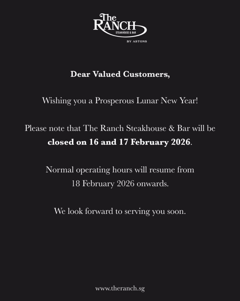 Wishing you a prosperous Lunar New Year! The Ranch Steakhouse & Bar will be closed on 16 and 17 February 2026. Normal operating hours will resume from 18 February 2025 onwards.